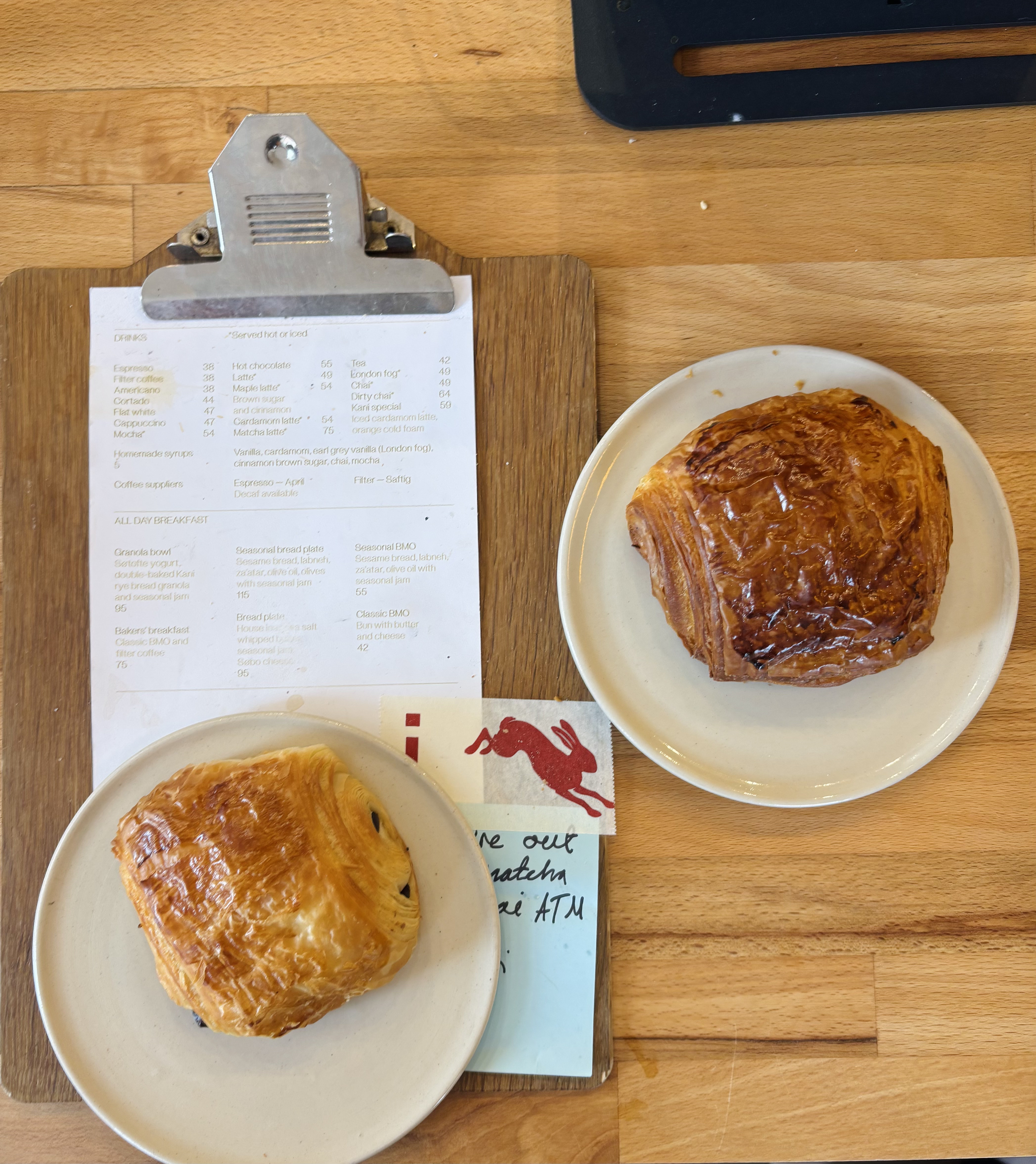 Behind the counter, several ultra-aesthetic pains au chocolat were on display. At the time of ordering, however, we were served deux pains that were… less aesthetic—even two different colours. Slightly disappointing.