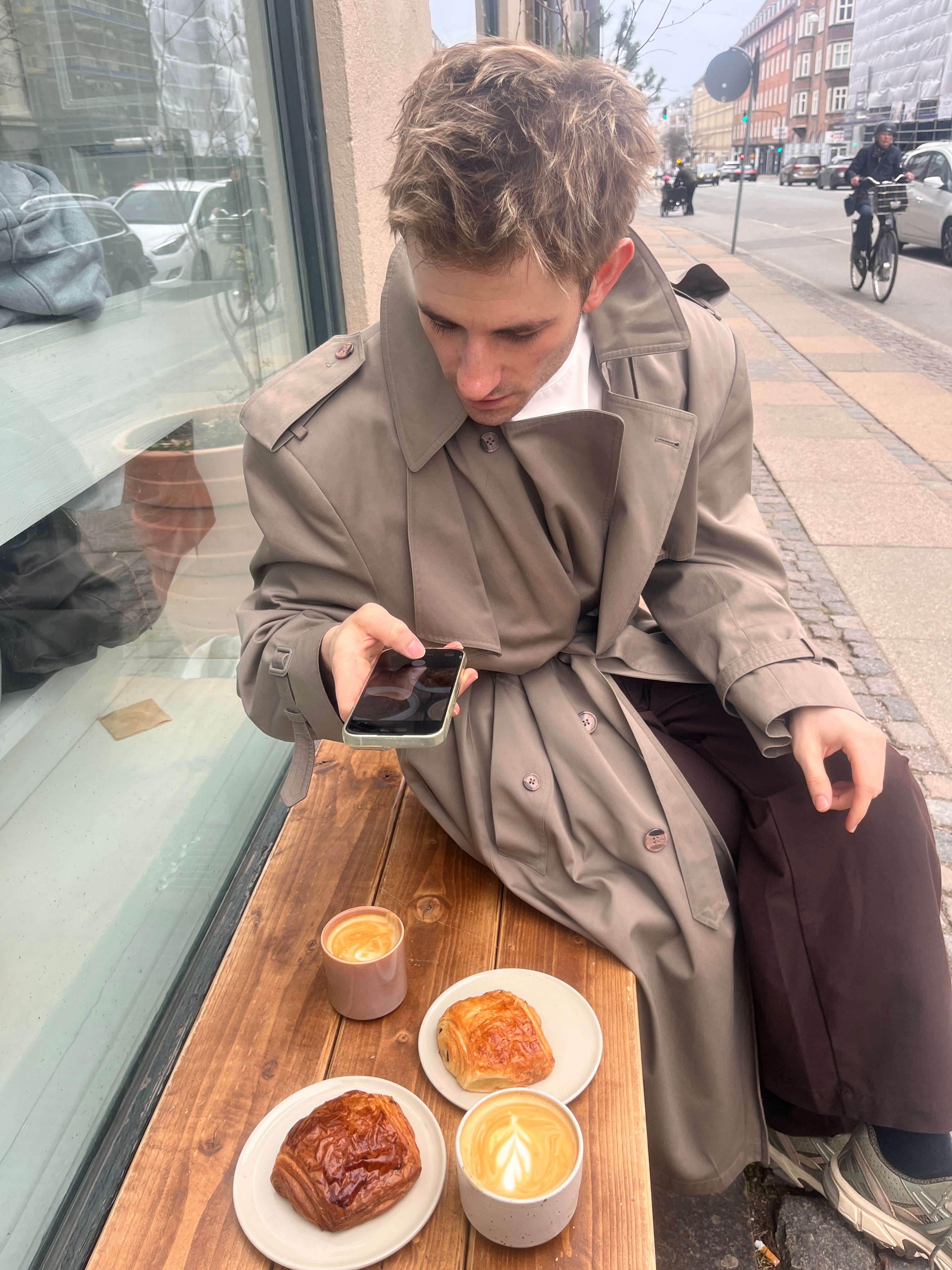 Bag montren kunne man se flere ultraæstetiske pains au chocolat. Ved bestillingen blev vi serveret deux pains, som var … mindre æstetiske — endda to forskellige farver. Lidt øv.